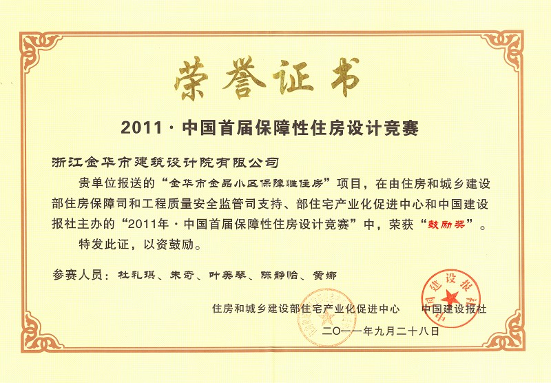 本院設(shè)計的“金品小區(qū)保障性住房”在住房和城鄉(xiāng)建設(shè)部舉辦的“2011年·中國首屆保障性住房設(shè)計競賽”中獲獎,并于第十屆中國國際住宅博覽會上舉行頒獎典禮。本次競賽的主題定為“以人為本,安居樂業(yè)”。旨在更好的推廣優(yōu)秀的保障性住房規(guī)劃設(shè)計方法,促進保障性安居工程設(shè)計和建設(shè)的標準化和模數(shù)化。