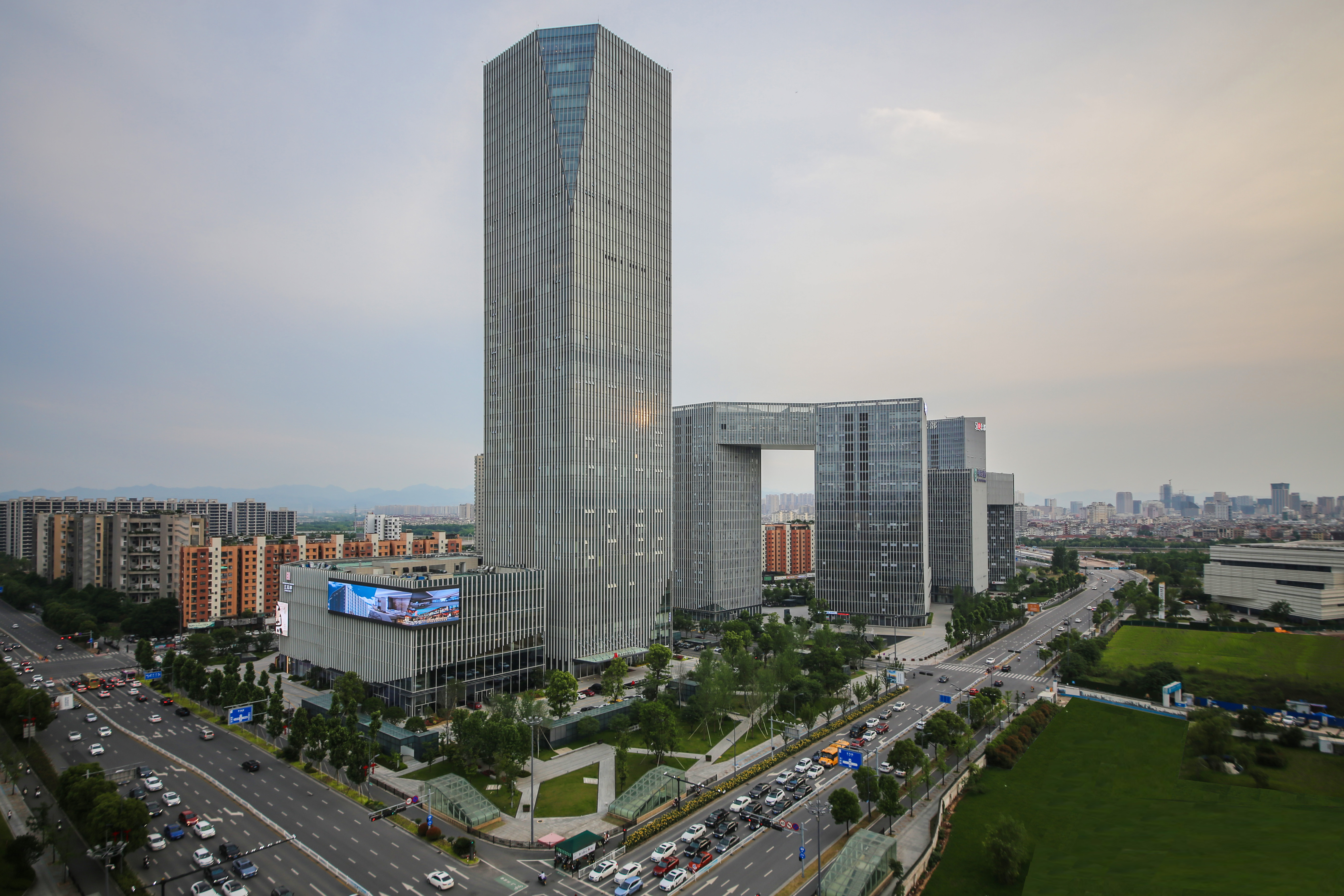 浙中互聯(lián)網(wǎng)總部經(jīng)濟(jì)中心(一期)位于金華市多湖區(qū)塊,由1號(hào)超高層綜合樓及2號(hào)~6號(hào)商務(wù)辦公建筑組成,項(xiàng)目總用地面積為44907平方米,總建筑面積290413.51平方米,其中地上建筑面積201147.74平方米,地下建筑面積89265.77平方米。1號(hào)樓地上43層,地下2層,建筑高度193.7米。